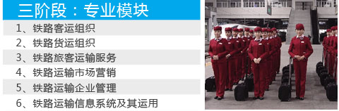 通过本专业全面系统的学习,毕业生可从事车站(助理)值班员、信号员、调车员、车站调度员、列车调度员、售票员、客运员、列车员、行李员等工作。